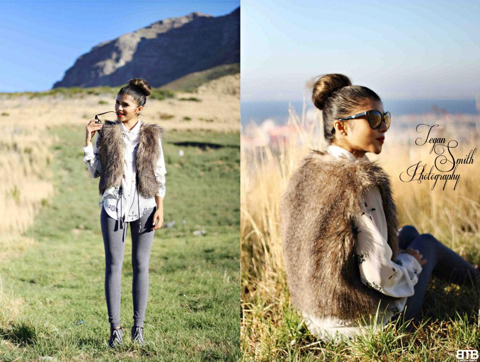 This shot is her full outfit, we HAD to show two versions as I loved the mountain in the background of the left image as well as the way she looks so tall BUT the image on the right had to be photographed, I could not ignore the contrast between her faux fur jacket and the long dry grass. One image is also more posed and the other is more natural.