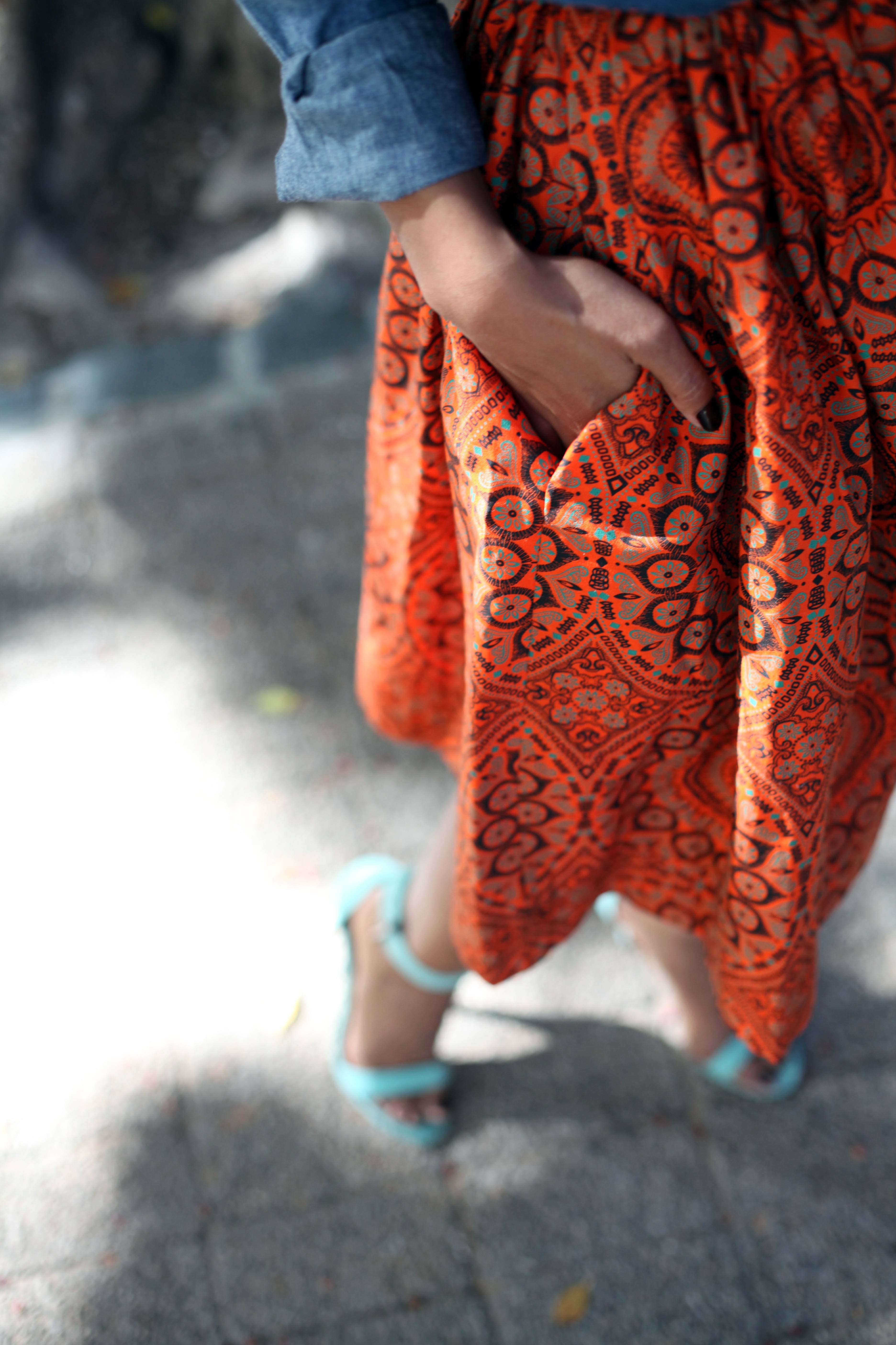 Excellent shots; love the skirt pattern and color. The top combination is great with the jeans button up shirt. Love those sandals! An ankle cuff with a single vamp strap is awesome and the color makes it just that much more perfect. 😉